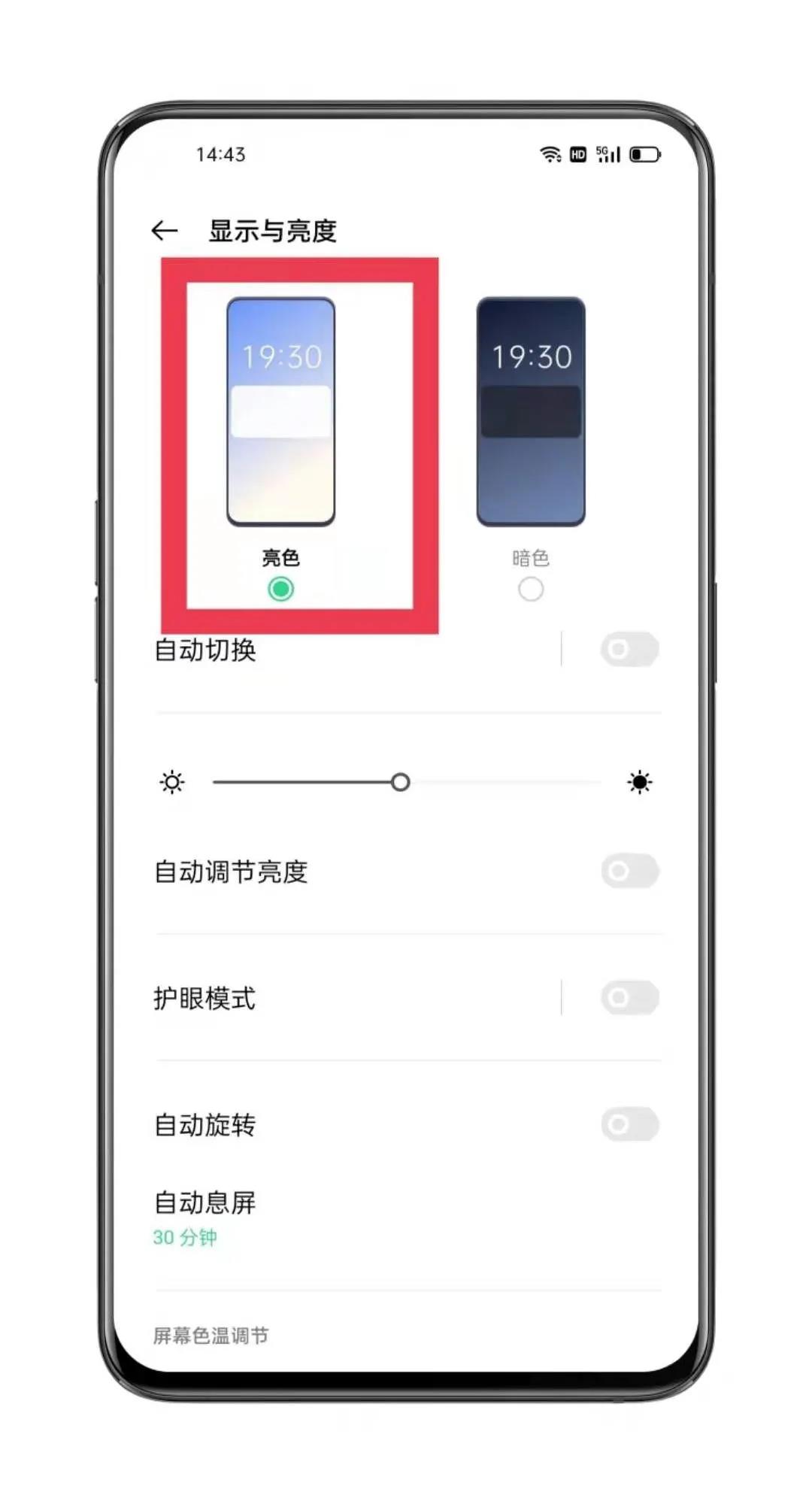 點(diǎn)擊【設(shè)置】-【顯色與亮度】或者長(zhǎng)按下拉菜單中【暗色模式】即可進(jìn)入調(diào)節(jié)